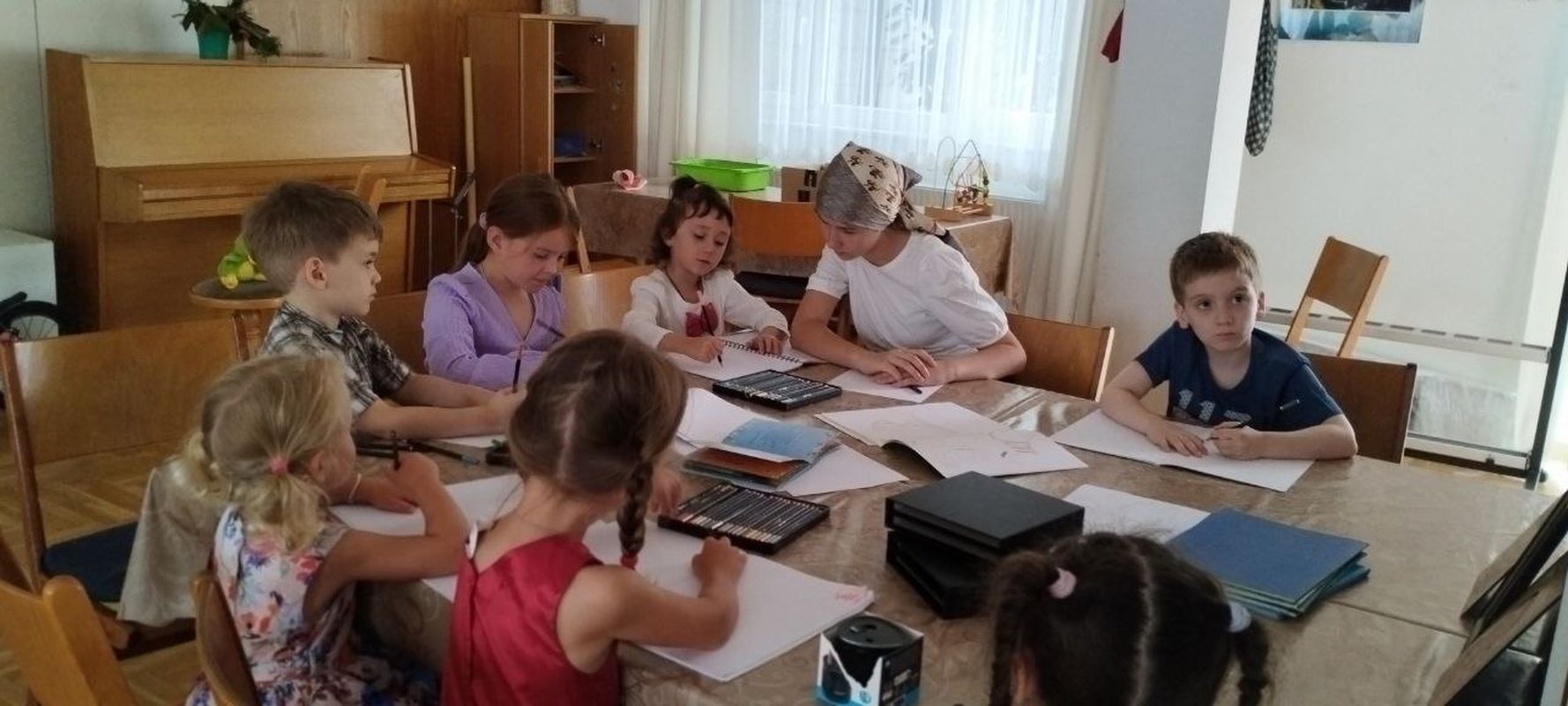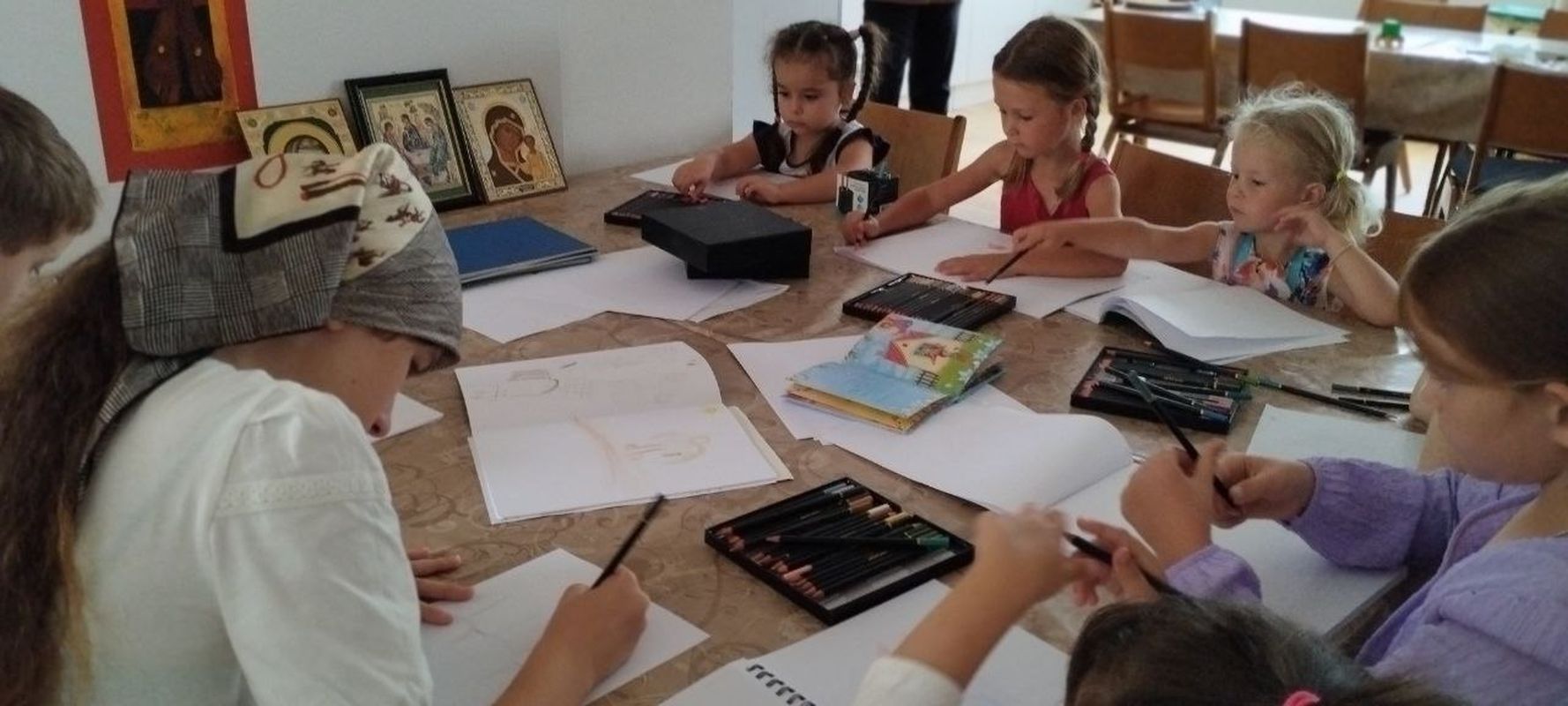 Во время литургии прихожанкой храма Наталией Кригер в трапезной проводилась воскресная школа для детей. Темой урока была молитва Господня.