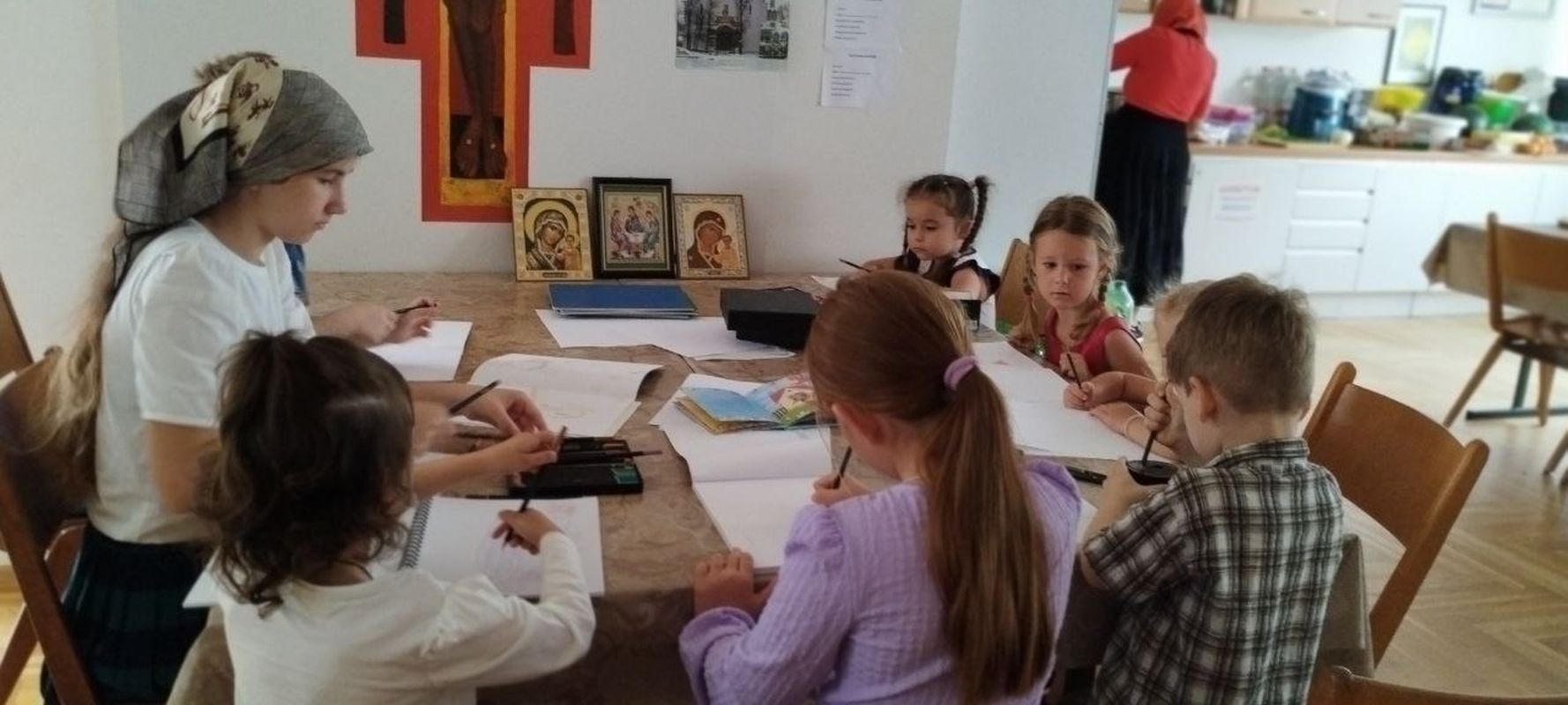 Während der Liturgie veranstaltete Kirchenmitglied Natalia Krieger im Refektorium eine Sonntagsschule für Kinder. Das Thema der Lektion war das Vaterunser.