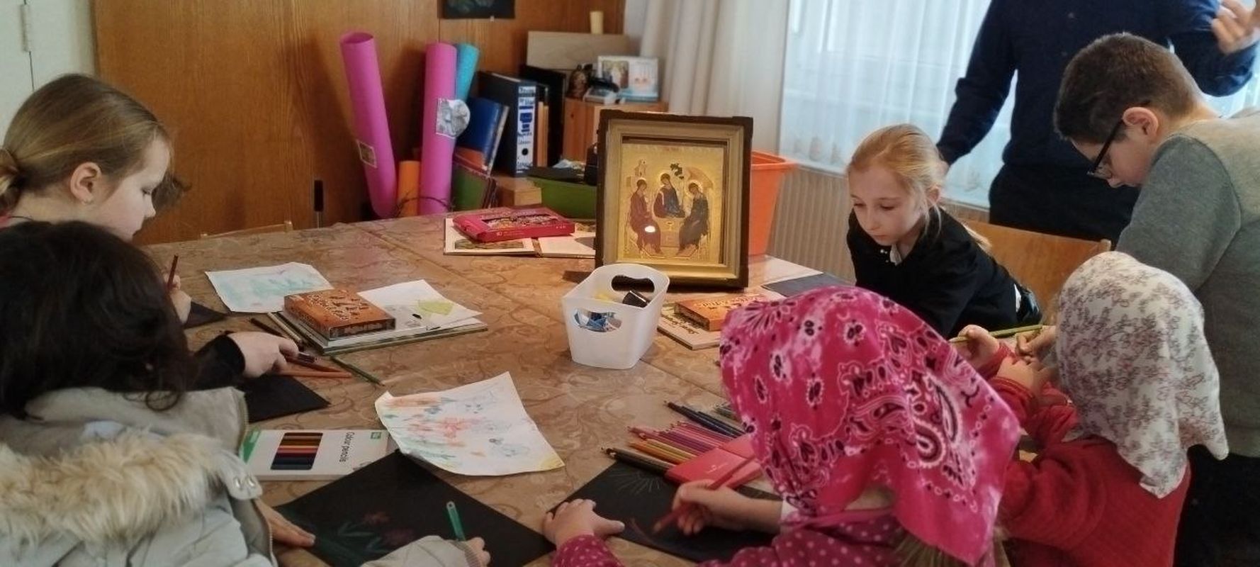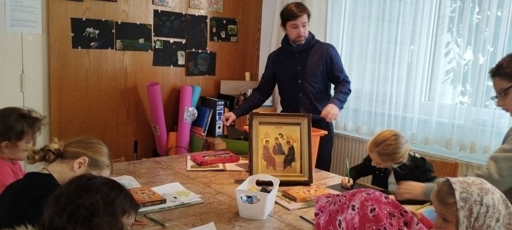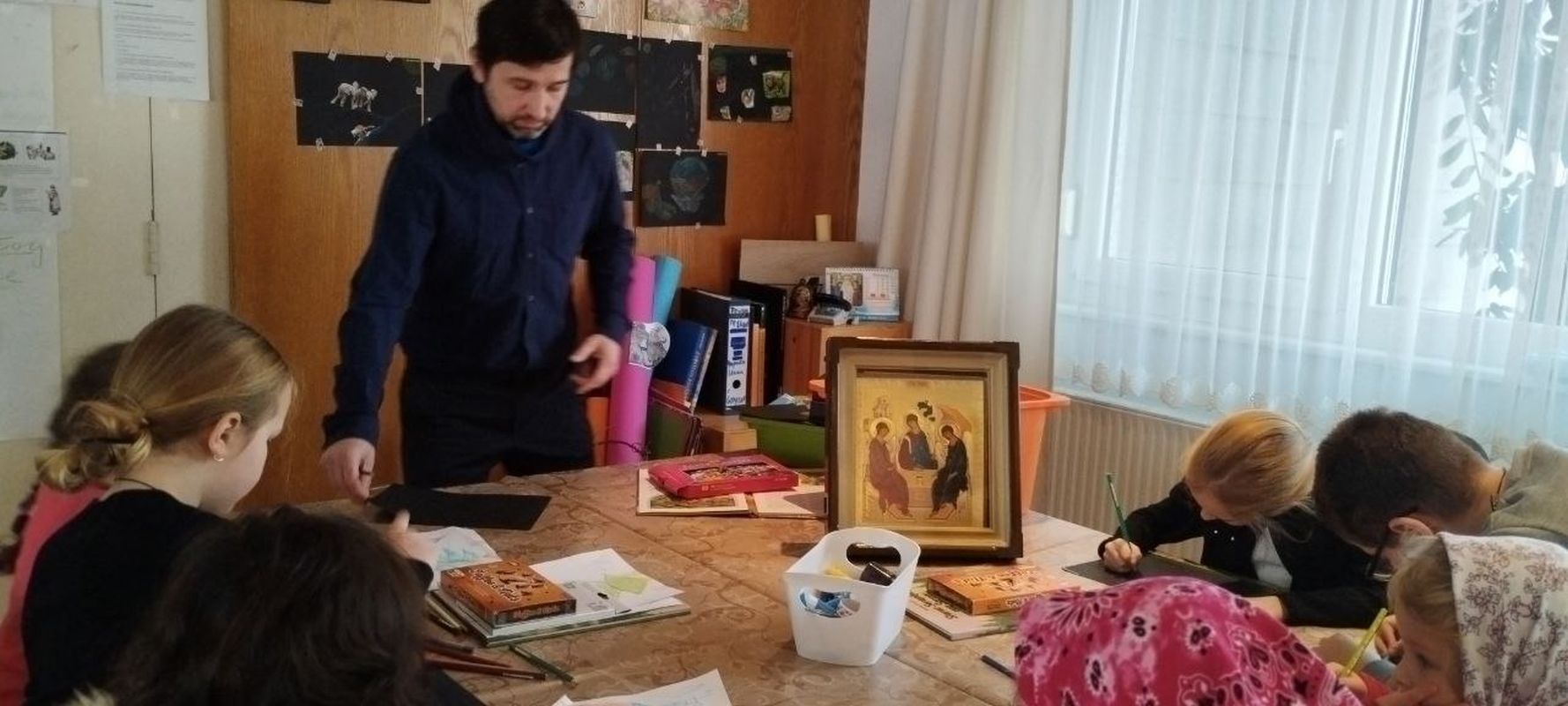 Во время литургии в трапезной храма Наталией Кригер  проводилась воскресная школа для детей. Продолжение изучения Закона Божьего: сотворение мира.