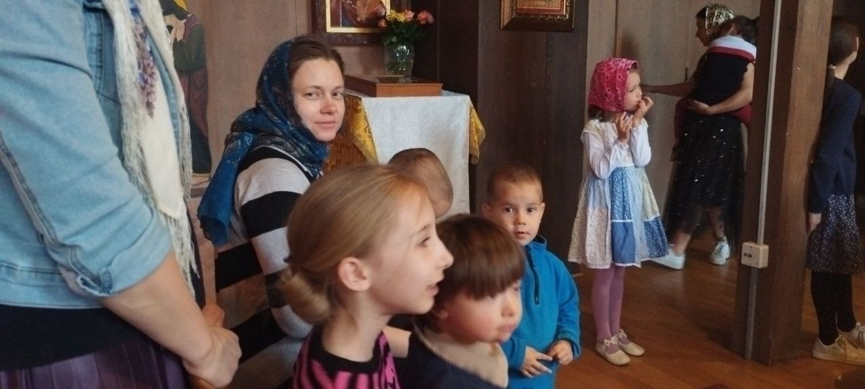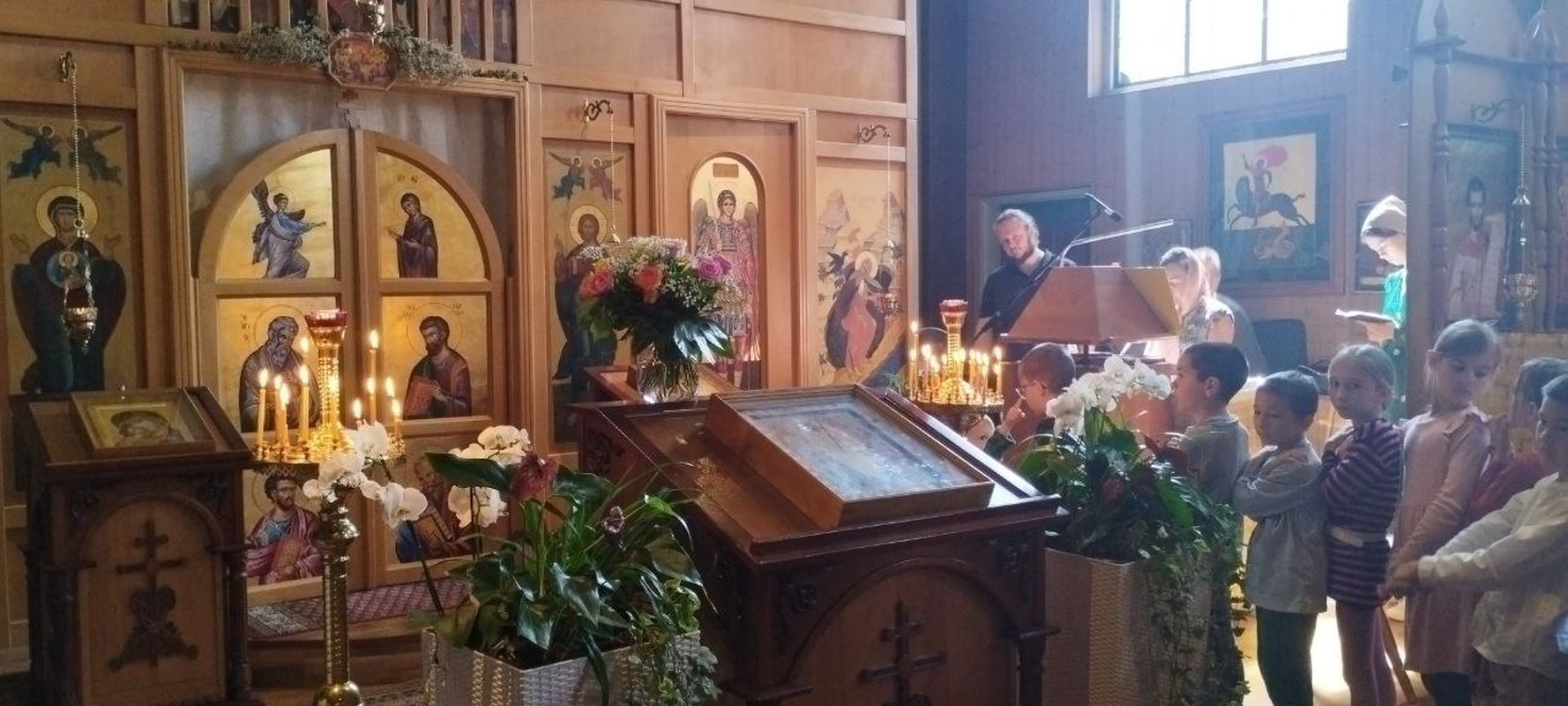 Während der Liturgie fand im Gemeindesaal der Kirche die Sonntagsschule für Kinder statt. Das Hauptthema war das Wunder der Heilung des Gelähmten durch Christus und die vom Apostel Petrus vollbrachten Wunder: die Heilung des lahmen Äneas und die Auferweckung der Tabitha.