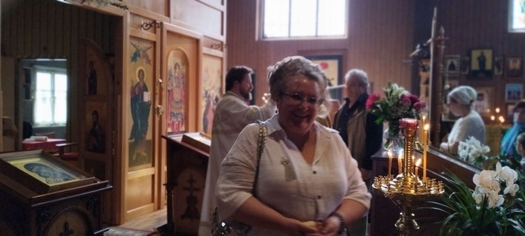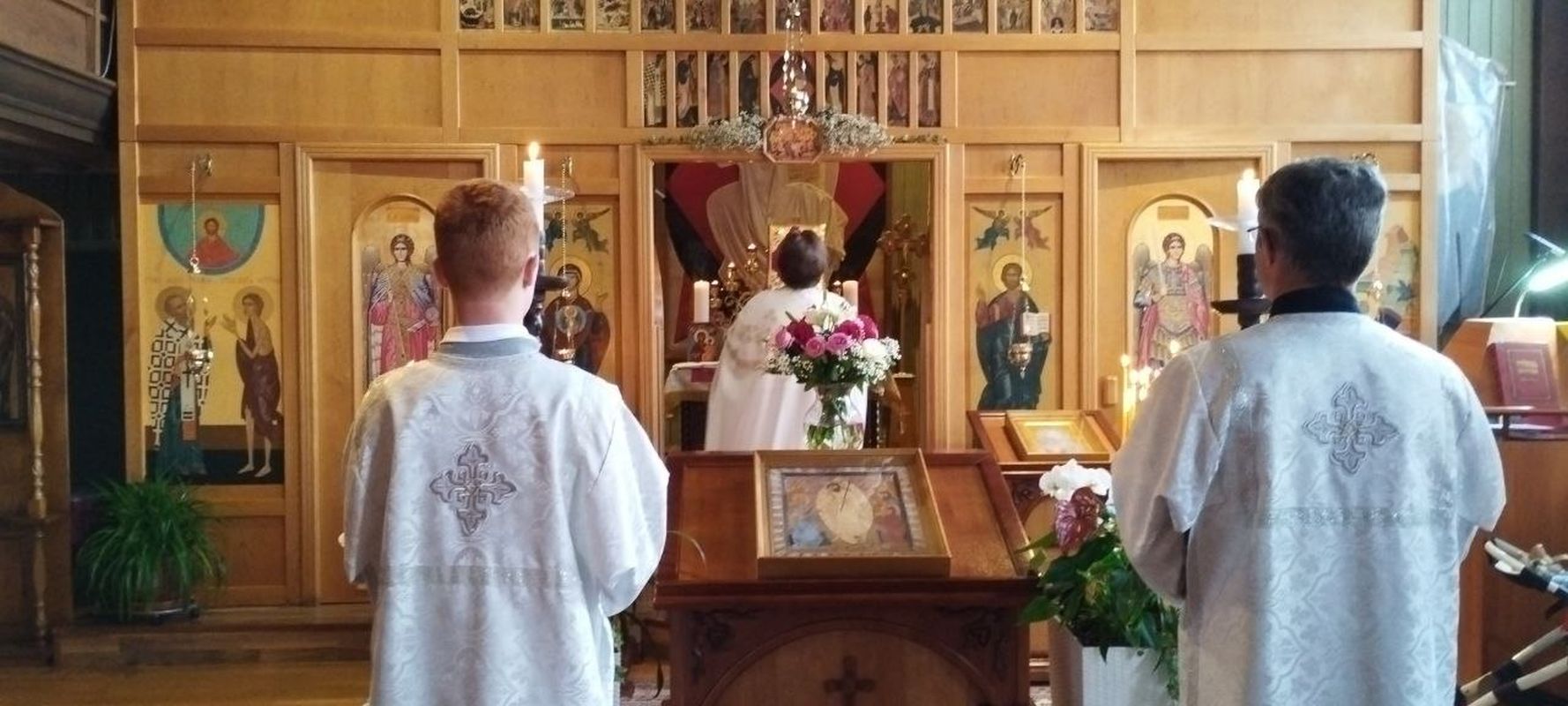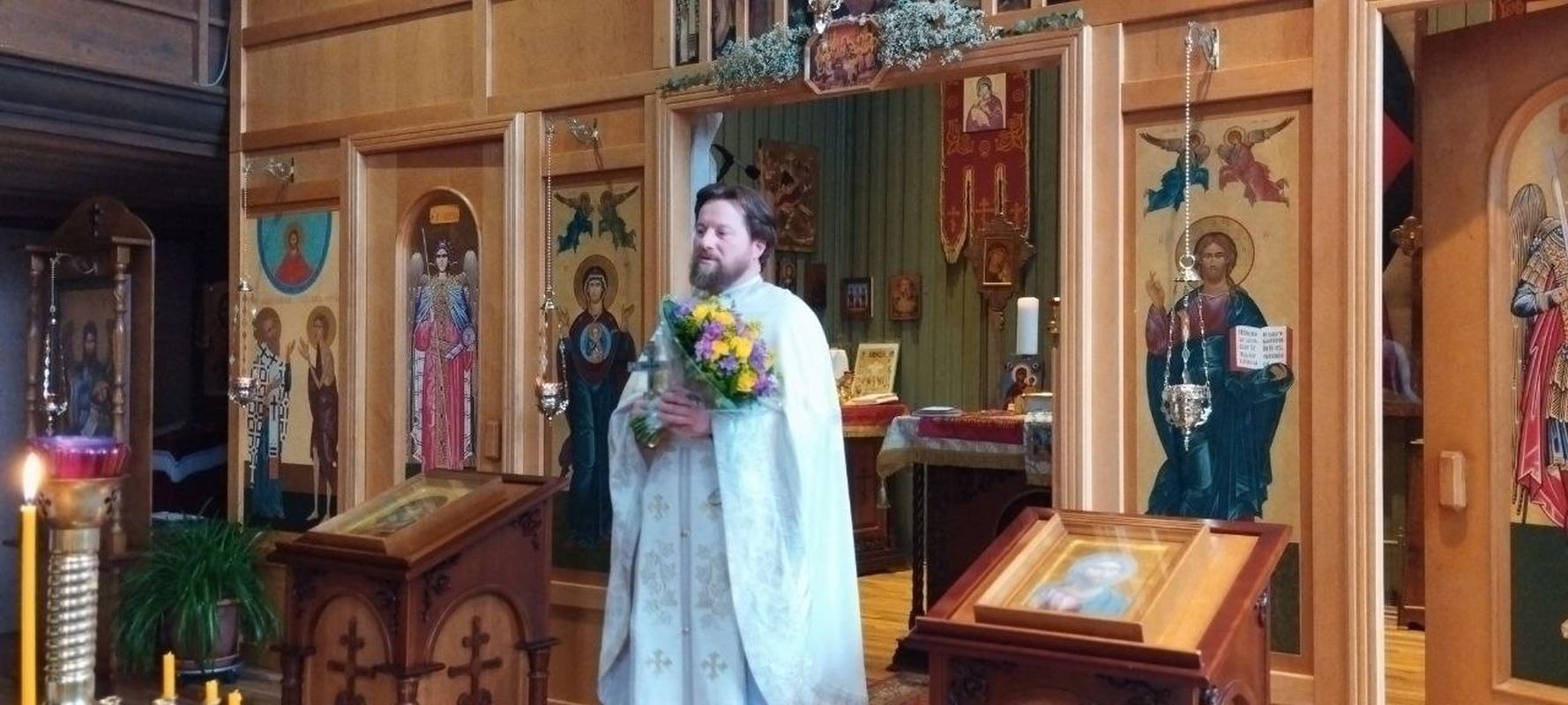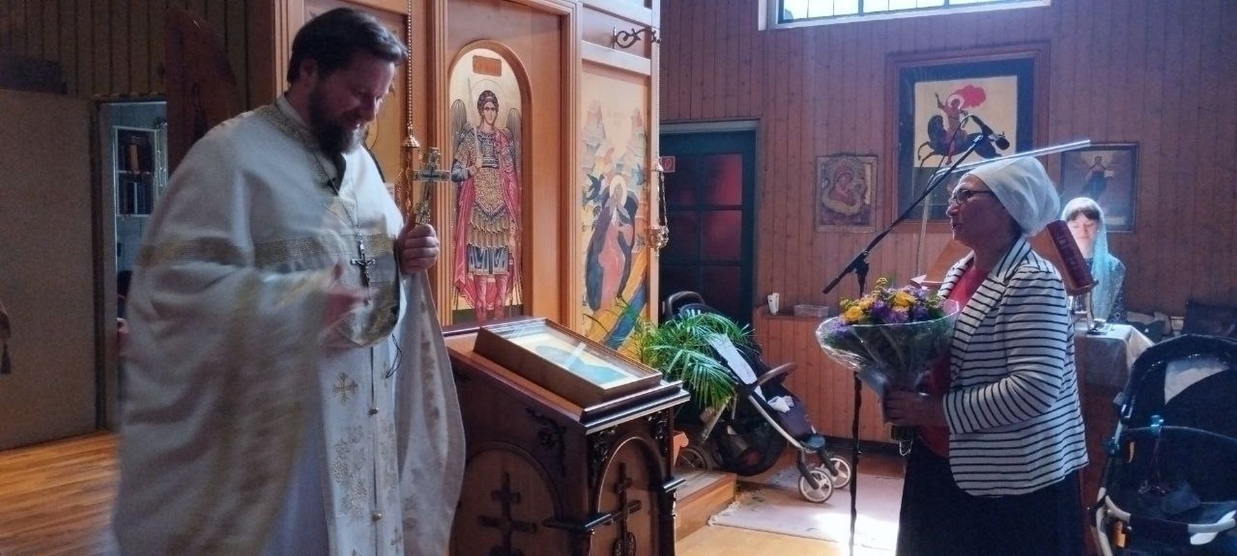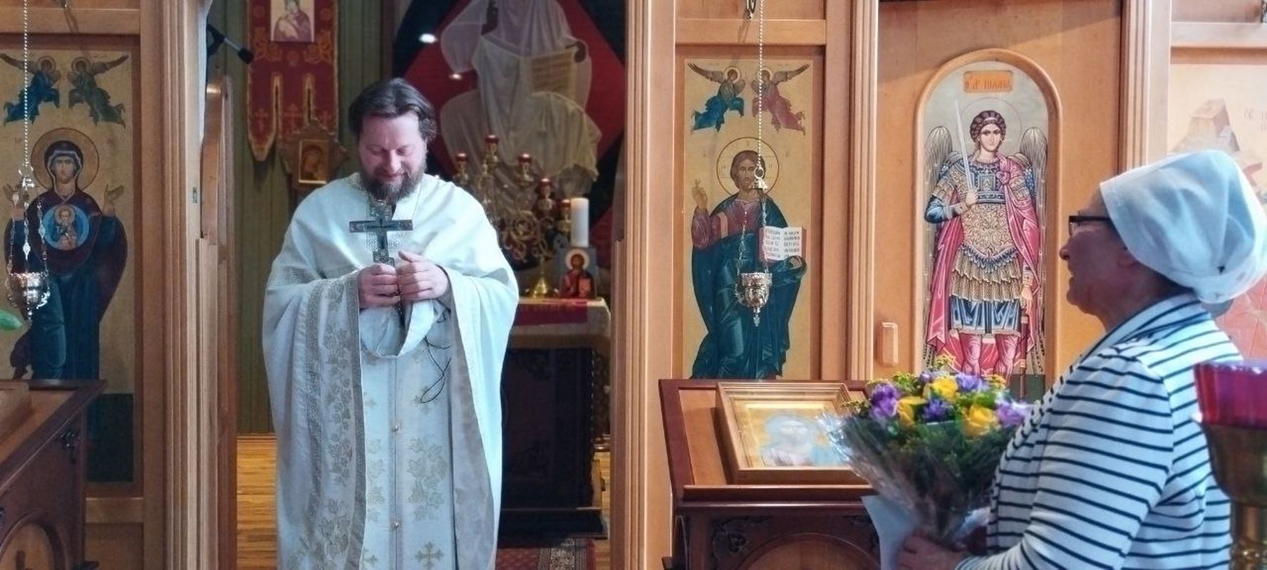 Nach dem Ende des Gottesdienstes wurden die zahlreichen Namenstagsfeiernden und der Pfarrer anlässlich seines Geburtstags beglückwünscht. Der Gemeindechor sang allen "Mnogaja Leta" (Auf viele Jahre).