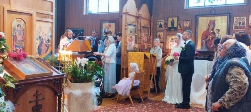 Nach Ende des Gottesdienstes wurde in Anwesenheit zahlreicher Gäste und Gemeindemitglieder das Sakrament der Trauung über das Brautpaar Mark und Maria vollzogen. Das Sakrament leiteten Erzpriester Ilya Limberger - Priester der Heilig-Nikolaus-Kathedrale der Stadt Stuttgart und Priester Dimitrij Maksimowitch - Priester unserer Gemeinde. Es wurden Gesänge von 3 Chören in verschiedenen Sprachen vorgetragen. Herzliche Glückwünsche und gebetsvolle Segenswünsche unseren Neuvermählten Mark und Maria.