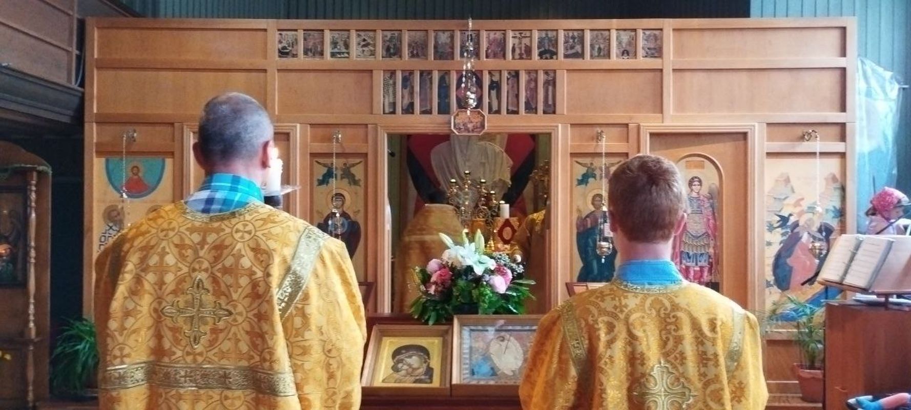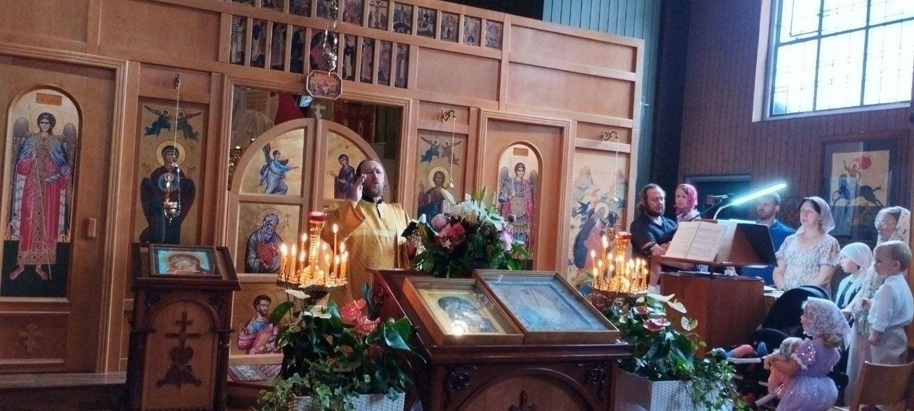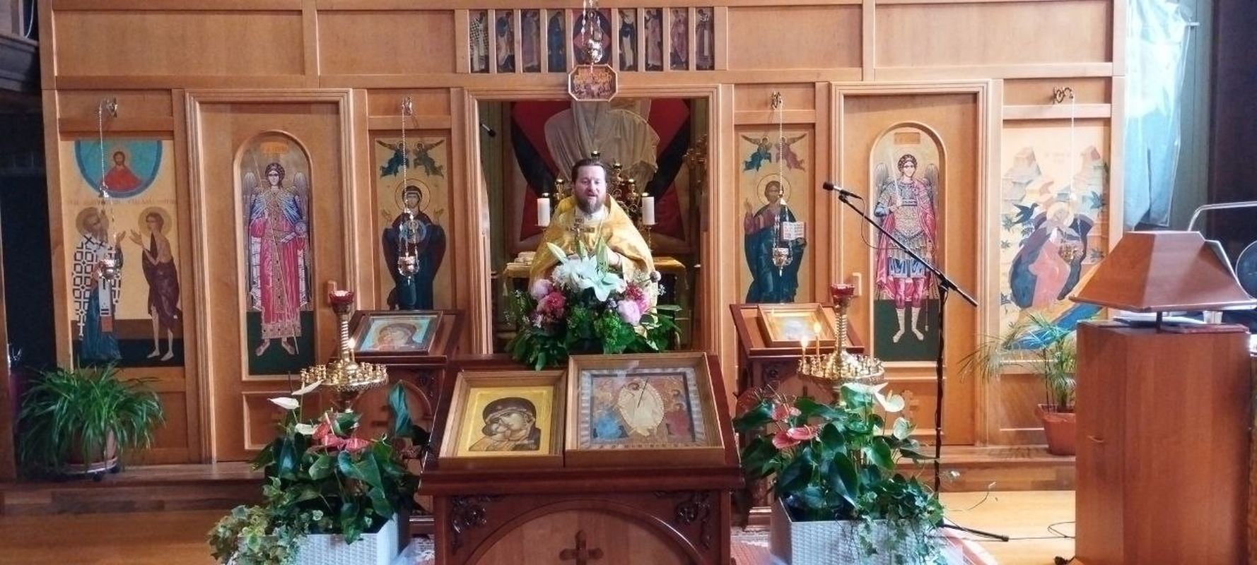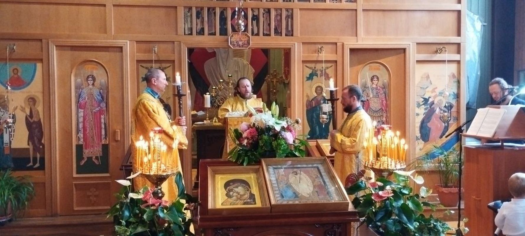 Den Gottesdienst zelebrierte der kommissarische Pfarrer, Priester Dimitrij Maksimovich, zusammen mit Diakon Evgenij Kik. Die Predigt war der Fürbitte der Allerheiligsten Gottesmutter am Beispiel der Wladimirer Ikone gewidmet.