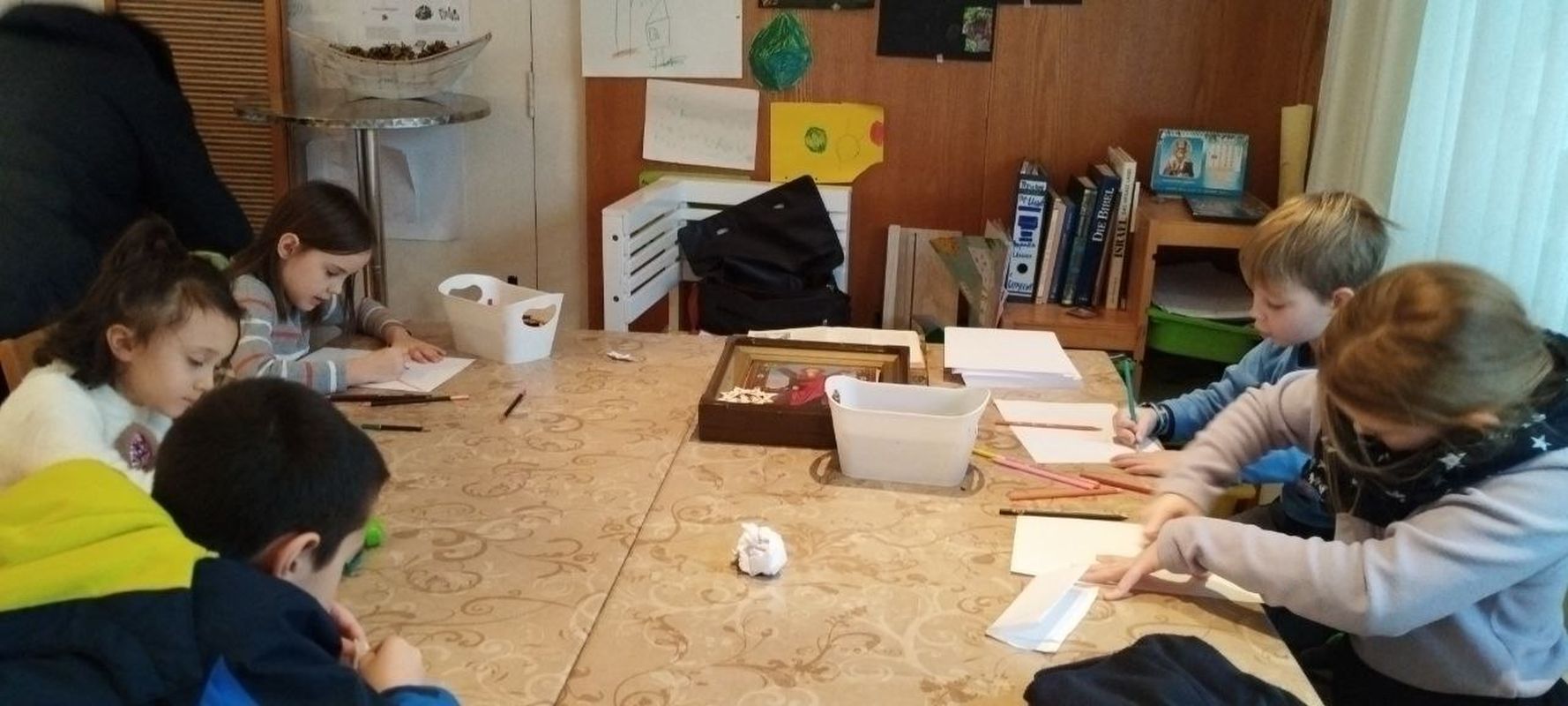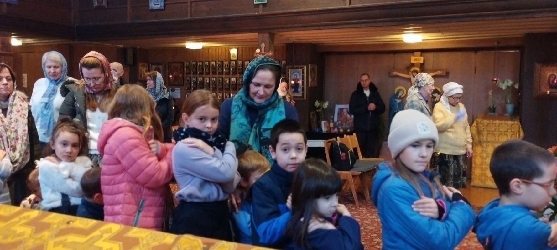 Во время литургии в трапезной храма Наталией Кригер проводилась детская воскресная школа. Главной темой была подготовка к празднику Рождества Христова. Говорилось о различных изображениях Креста Господня, а также Андреевского креста.
